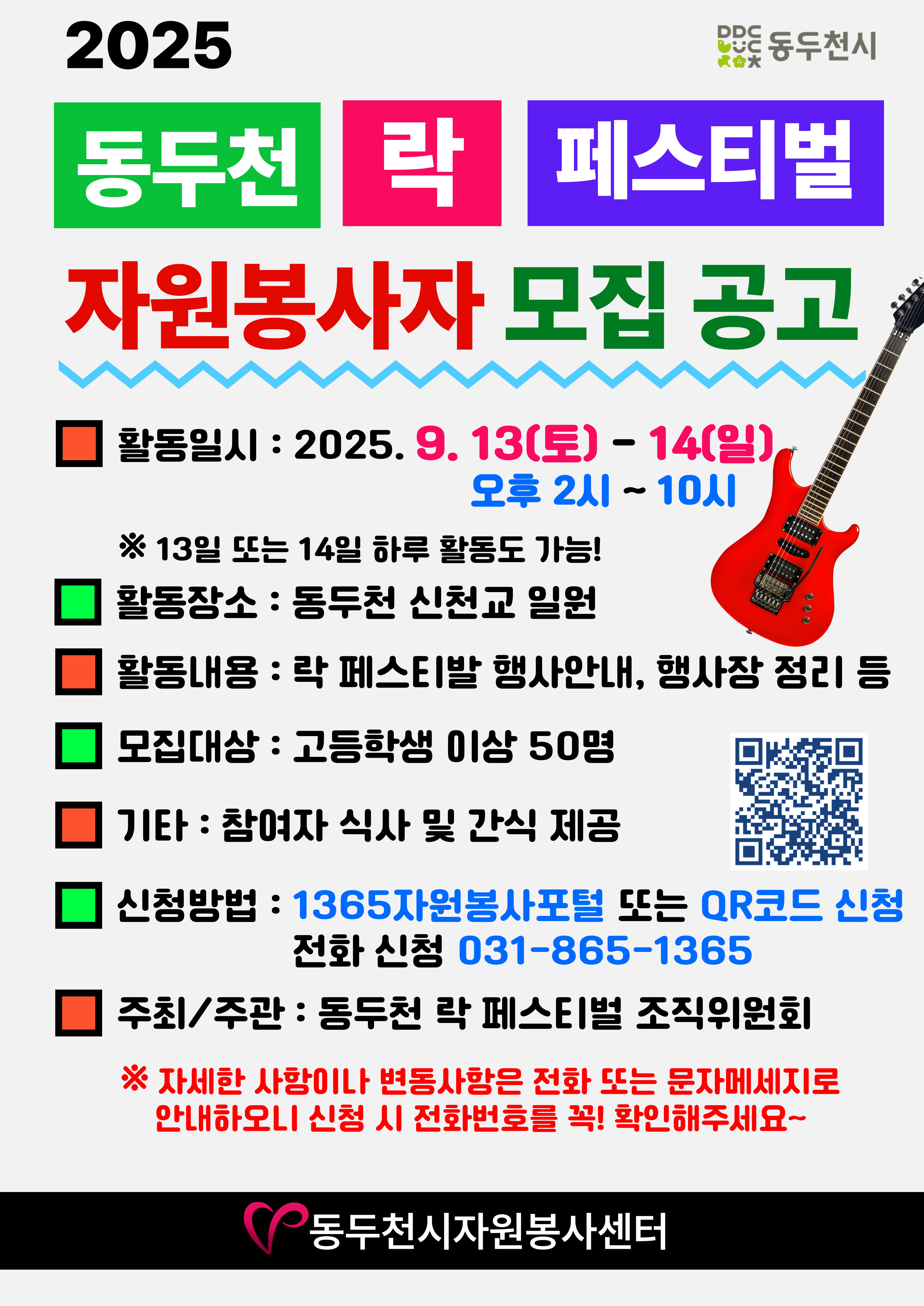 동두천시자원봉사센터에서는 동두천 락 페스티벌 조직위원회에서 주최/주관하는 제25회 동두천락페스티벌 자원봉사자를 아래와 같이 모집합니다.
