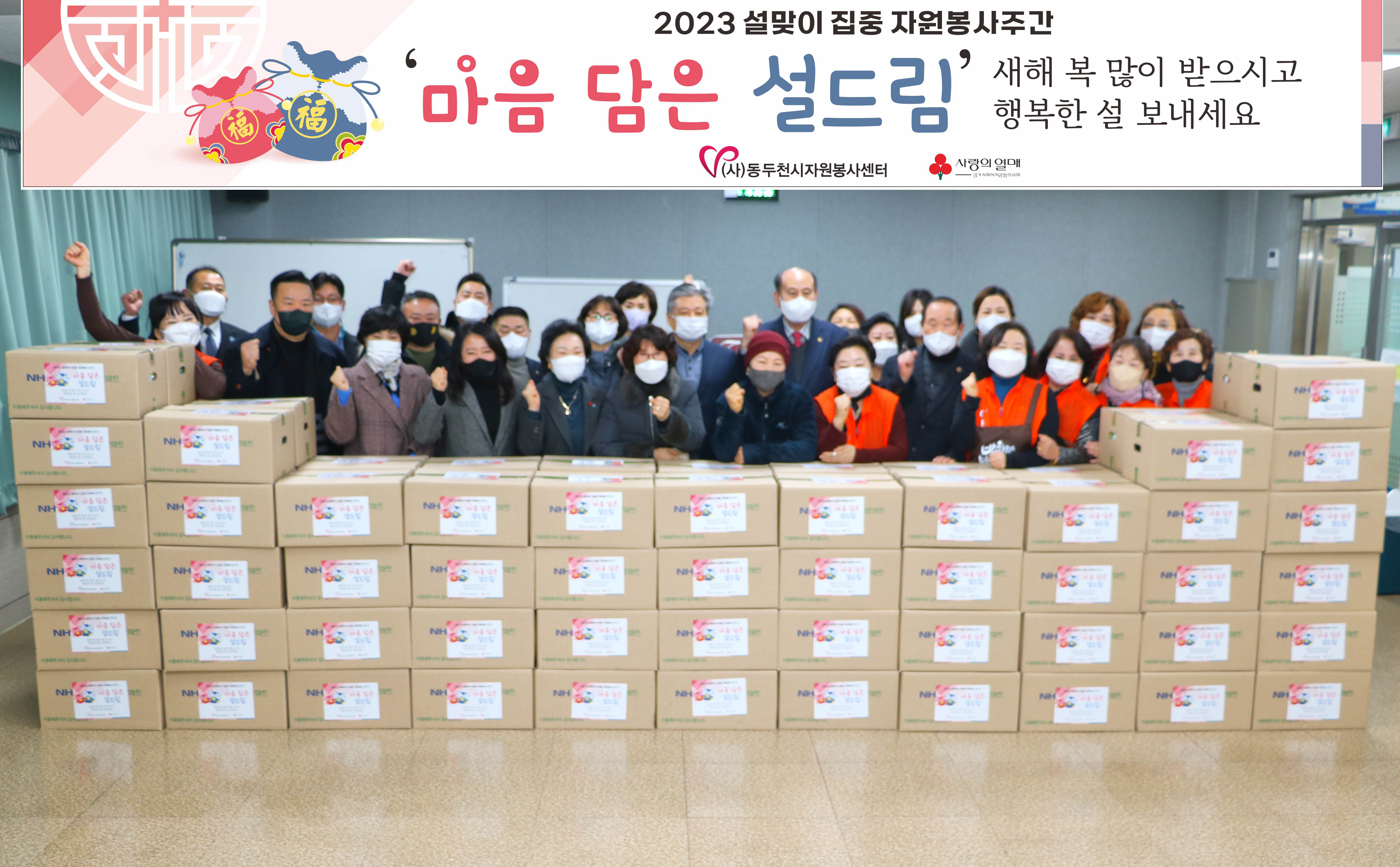 자원봉사센터에서는 「2023 설맞이 집중 자원봉사주간」 을 맞아 사회복지 공동모금회 배분사업 ‘ 마음 담은 설드림 ’ 으로 나눔키트(라면, 햇반, 통조림햄, 국수, 음료 등) 35천원 상당 100박스를 제작하여 8개동 행정복지센터를 통해 선정한 대상자에 배부 했다.