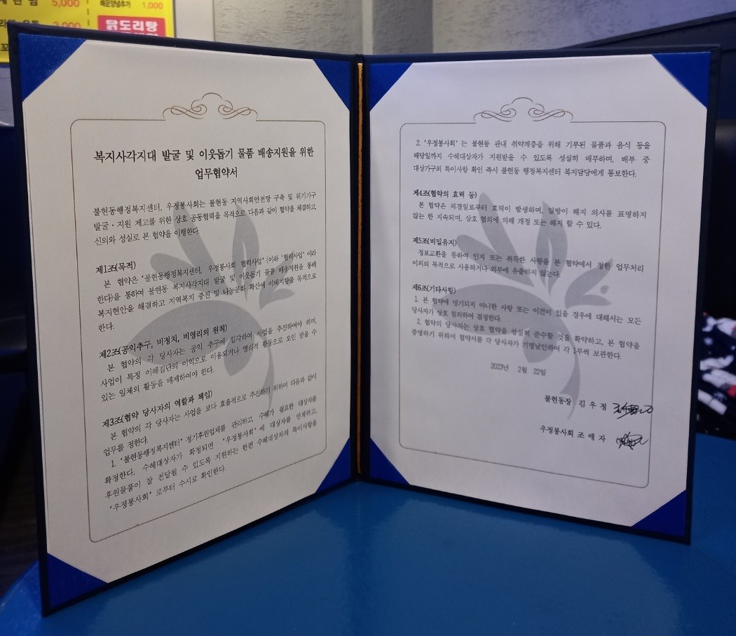 한편 우정봉사회는 지난 2월 22일 불현동 행정복지센터(동장 김우정)와 "복지사각지대 발굴 및 이웃돕기 물품 배송지원을 위한 업무협약식"을 맺은 바 있다.